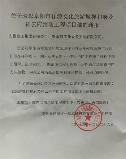 12月26日,阜陽市祥源文化旅游城業(yè)主單位安徽祥源文化旅游城投資有限公司發(fā)來通報,就公司第四分公司阜陽市祥源文旅城消防工程項目部在一期工程施工中的突出表現(xiàn)給予表彰!