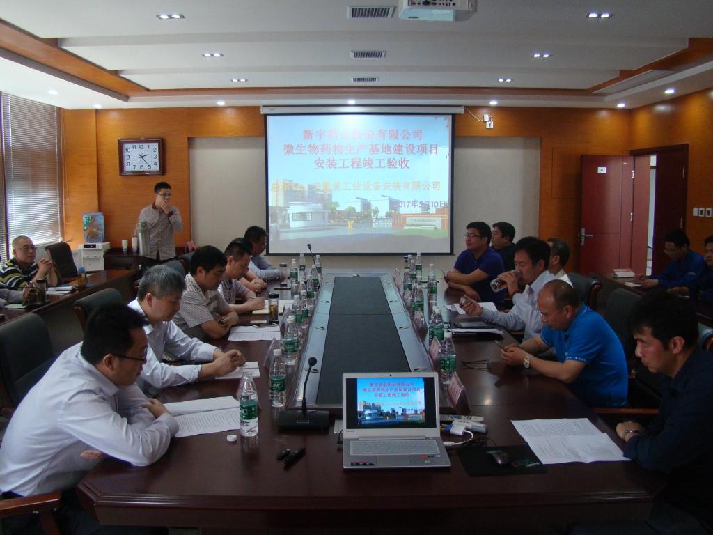 2017年5月10日下午,新宇藥業(yè)微生物藥物生產(chǎn)基地項目安裝工程竣工驗收會議在新宇藥業(yè)股份有限公司召開,新宇藥業(yè)股份有限公司總經(jīng)理萬曉飛、總工程師朱立元、總會計師蔣峰、項目總指揮李利、副總指揮李民、陳海軍以及相關(guān)部門同志參加會議,安徽安裝公司黨委書記胡六中、副總經(jīng)理劉安俊、紀委書記李寬旭、總會計師張元斌、總工程師吳繼成等應邀出席。