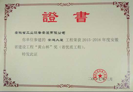 日前,2015-2016年度安徽省建設(shè)工程“黃山杯”(省優(yōu)質(zhì)工程)獲獎(jiǎng)工程項(xiàng)目名單公布,公司參建的“安建大廈”通過形式審查、現(xiàn)場(chǎng)復(fù)查、評(píng)審委員會(huì)評(píng)審等程序,同獲該項(xiàng)殊榮。至此,公司榮獲“黃山杯”達(dá)11尊。同時(shí)“濱湖中心1-3#樓空調(diào)系統(tǒng)工程 ”還榮獲2017年度中國(guó)安裝工程優(yōu)質(zhì)獎(jiǎng)(中國(guó)安裝之星)。