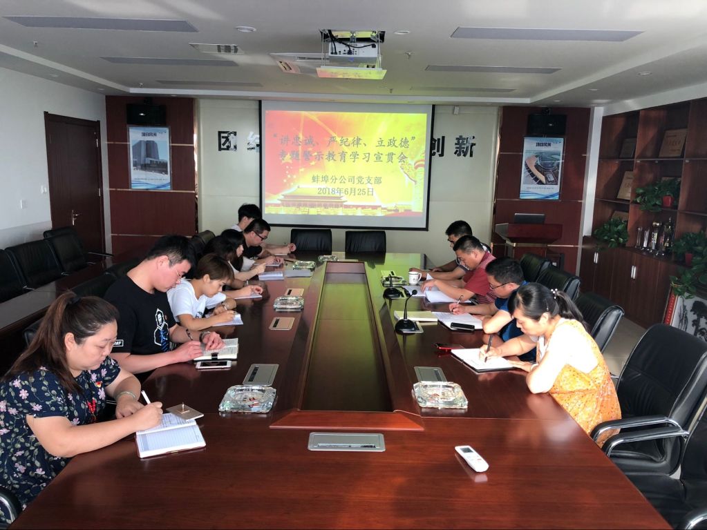 6月26日下午,蚌埠分公司黨支部召開(kāi)了“講忠誠(chéng)、嚴(yán)紀(jì)律、立政德”專題警示教育學(xué)習(xí)宣貫會(huì),分公司黨員及機(jī)關(guān)員工參加會(huì)議。