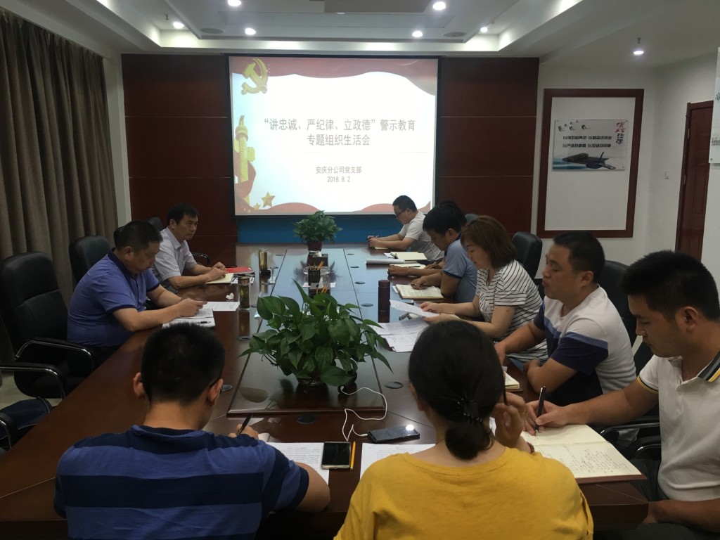 8月2日下午,安慶分公司黨支部組織召開(kāi)了“講忠誠(chéng)、嚴(yán)紀(jì)律、立政德”警示教育專題組織生活會(huì),公司董事長(zhǎng)、總經(jīng)理、黨委副書記王軍邦,紀(jì)委書記、工會(huì)主席李寬旭到會(huì)指導(dǎo)。分公司領(lǐng)導(dǎo)班子成員、支部黨員參加了會(huì)議,會(huì)議由分公司黨支部書記劉紅艷主持。