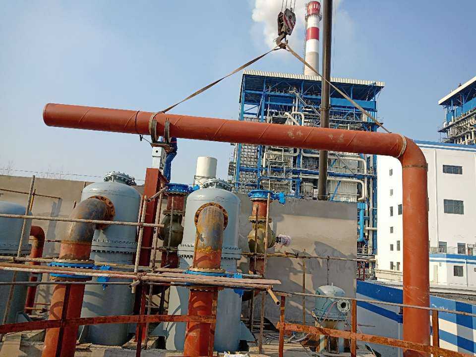 阜陽(yáng)國(guó)禎供熱首站機(jī)電安裝工程蒸汽管道施工內(nèi)容包括Φ630蒸汽管道在8.5m的高空架設(shè)、彈簧支架及槽鋼支架的敷設(shè)、與換熱器進(jìn)出口的對(duì)接等;因施工現(xiàn)場(chǎng)存在場(chǎng)地小、作業(yè)面狹窄等諸多困難,蒸汽管道架空敷設(shè)任務(wù)異常艱巨。此次蒸汽管道吊裝,項(xiàng)目部提前合理部署,多次優(yōu)化方案,在各方力量的通力配合下,齊心協(xié)力,圓滿(mǎn)地完成架空敷設(shè)任務(wù),整個(gè)吊裝過(guò)程平穩(wěn)、安全,獲得了業(yè)主方的贊許與肯定。