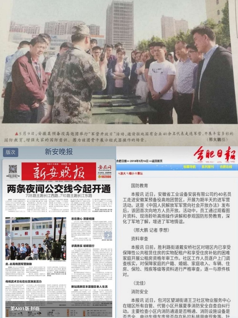 自5月9日安徽安裝公司組織開(kāi)展赴安徽預(yù)備役師高炮團(tuán)營(yíng)區(qū)開(kāi)展“走進(jìn)軍營(yíng)·感受軍魂”愛(ài)國(guó)主義教育實(shí)踐活動(dòng)以來(lái),合肥日?qǐng)?bào)、新安晚報(bào)、人民陸軍報(bào)等多家媒體對(duì)此活動(dòng)進(jìn)行了報(bào)道。