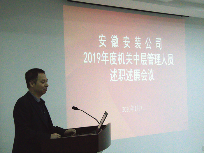 1月7日上午,安徽安裝公司召開2019年度機(jī)關(guān)中層管理人員述職述廉會議。公司領(lǐng)導(dǎo)班子成員、機(jī)關(guān)中層管理人員、分公司黨政負(fù)責(zé)人、機(jī)關(guān)部門員工代表共60余人參加了此次會議。會議由公司黨委書記、董事長胡六中主持。