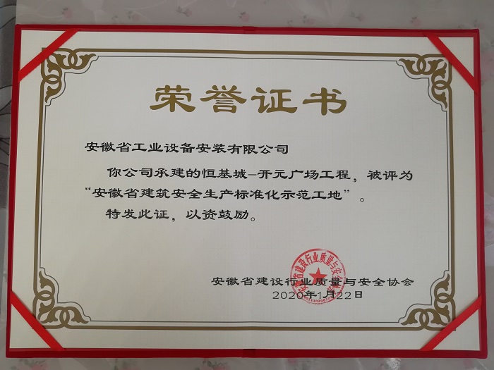 2019年12月,淮北恒基城開元廣場項(xiàng)目開始對項(xiàng)目文明標(biāo)化進(jìn)行申報(bào),并著手準(zhǔn)備文明標(biāo)化申報(bào)資料,經(jīng)過項(xiàng)目管理人員的不懈努力,項(xiàng)目于2020年1月13日順利通過安徽省建筑安全生產(chǎn)標(biāo)準(zhǔn)化示范工地驗(yàn)收工作,2019年4月份取得“安徽省建筑安全生產(chǎn)標(biāo)準(zhǔn)化示范工地”榮譽(yù)稱號(hào)。