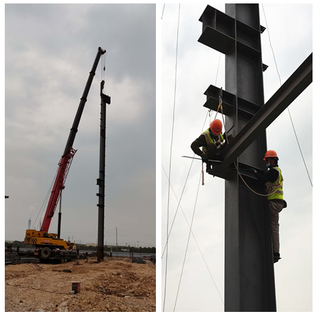 伴隨著隆隆的吊車轟鳴聲,閃爍的電焊火花,縱橫交錯的鋼構(gòu)架拼裝,一道道工序正在有條不紊的進(jìn)行著……這是走進(jìn)蕪湖宇培年產(chǎn)50萬方建筑工業(yè)化構(gòu)件生產(chǎn)基地項目鋼結(jié)構(gòu)工程,看到的一片繁忙施工景象。因受疫情的影響,項目部2020年3月5日接到總包的復(fù)工復(fù)產(chǎn)通知,3月6日立即組織召開復(fù)工會議,全面部署“防疫”舉措和生產(chǎn)任務(wù)。在做好施工必備的人、材、機(jī)進(jìn)場和安全教育及技術(shù)交底后,3月11日,當(dāng)?shù)谝桓?7米高的廠房跨立柱穩(wěn)穩(wěn)地吊裝成功后,項目部全面啟動,按下?lián)尮ぁ翱爝M(jìn)鍵”。