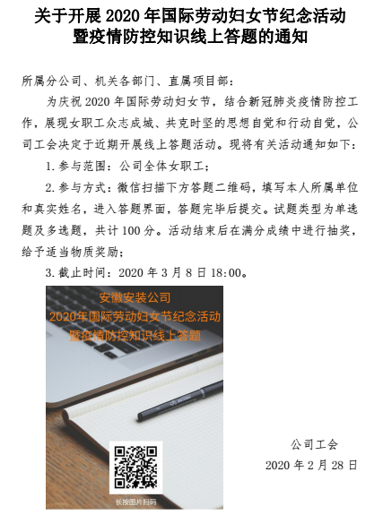 鑒于當(dāng)前新冠肺炎疫情防控特殊時(shí)期,本著不聚集、少聚集的原則,安徽安裝公司工會(huì)組織全公司八十多名女職工參加了疫情防控和《婦女權(quán)益保障法》等知識(shí)的學(xué)習(xí),利用微信平臺(tái)開展了線上答題活動(dòng),活動(dòng)一推出,廣大女職工立即響應(yīng),熱情高漲,對(duì)于不太清楚的問題,主動(dòng)查閱相關(guān)資料,與身邊的同事討論,對(duì)模棱兩可的問題,仔細(xì)斟酌精確作答。通過此次答題活動(dòng),全公司范圍內(nèi)再一次掀起宣傳疫情防控常識(shí)的熱潮,推動(dòng)公司疫情防控工作的開展,也進(jìn)一步普及了新時(shí)期下女職工的合法權(quán)益。答題活動(dòng)結(jié)束后,對(duì)優(yōu)秀成績(jī)給予獎(jiǎng)勵(lì)。
