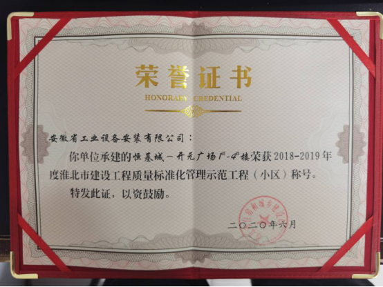 近日,安徽安裝公司承建的淮北恒基城開元廣場項目工程榮獲“2018--2019年度淮北市建設工程質(zhì)量標準化管理示范工程(小區(qū))”稱號。