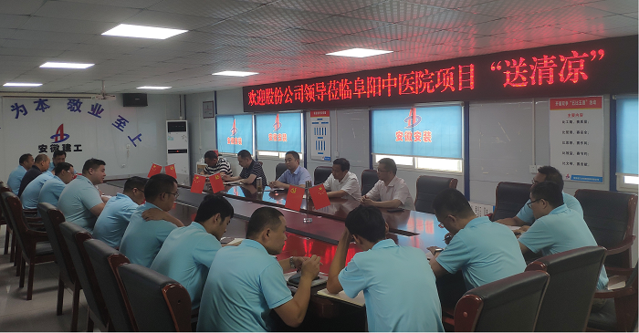 7月16日上午,股份公司副總經(jīng)理黃代、證券事務部副部長盛道勝赴安徽安裝公司阜陽潁東區(qū)中醫(yī)院建設PPP項目“送清涼”并調(diào)研指導工作。安徽安裝黨委書記、董事長胡六中,副總經(jīng)理高飛參加調(diào)研。