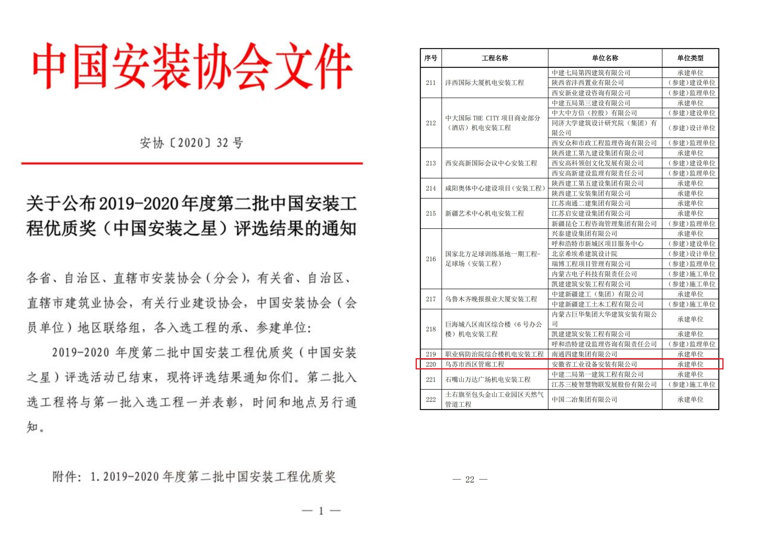 12月10日,經(jīng)中國安裝協(xié)會(huì)評(píng)選,由安徽安裝公司承建的新疆烏蘇市西區(qū)管廊工程成功獲得中國安裝工程優(yōu)質(zhì)獎(jiǎng) (中國安裝之星),這也是我公司首獲的工業(yè)設(shè)備安裝類中國安裝工程優(yōu)質(zhì)獎(jiǎng)。