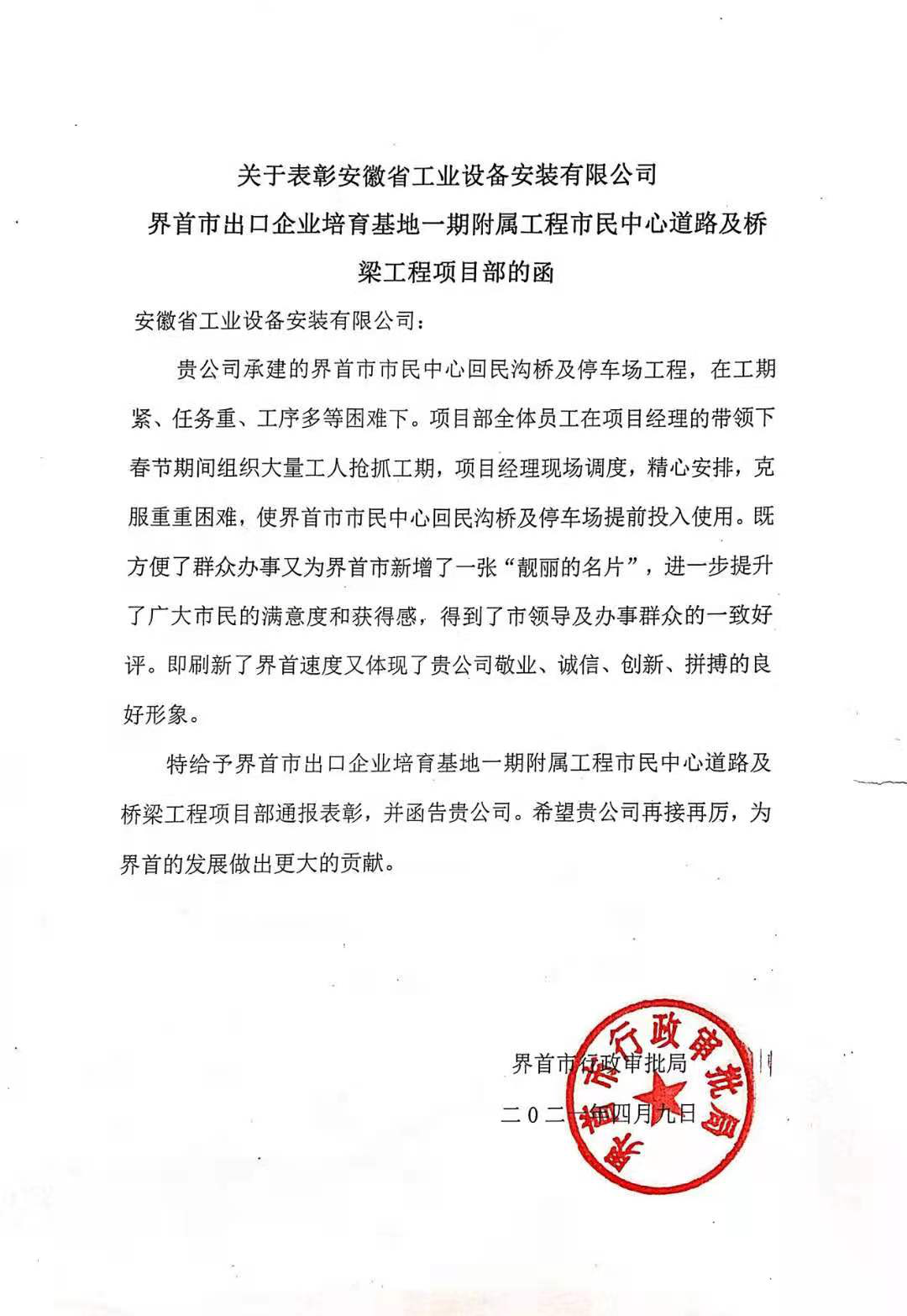 近日,界首市行政審批局發(fā)來(lái)通報(bào)函,就合肥分公司界首市出口企業(yè)培育基地一期附屬工程市民中心道路及橋梁工程項(xiàng)目部在工程施工中的突出表現(xiàn)給予通報(bào)表彰!