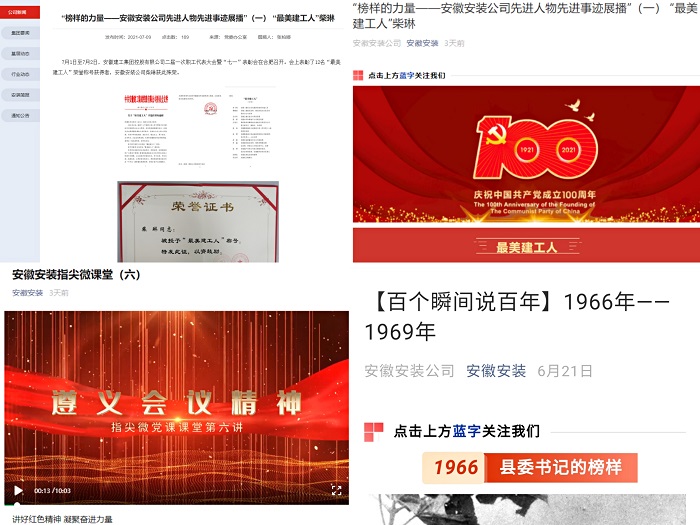 公司黨委第一時間編印??麄靼鍒笙掳l(fā)至所屬各單位和基層項目一線,用好企業(yè)網(wǎng)站、微信公眾號、電子屏、宣傳欄和所屬各單位、各項目部所有宣傳陣地,在公司網(wǎng)站、微信公眾號先后開設(shè)“百個瞬間說百年”“黨史學(xué)習(xí)教育專欄系列報道”“榜樣的力量——安徽安裝公司先進人物先進事跡展播”“記錄奮進力量—安徽安裝公司基層一線事跡展播”等專欄進行專題宣傳,大力營造“學(xué)習(xí)黨史有熱情,干事創(chuàng)業(yè)有激情”的良好氛圍,合肥分公司黨支部舉辦黨史學(xué)習(xí)教育主題攝影大賽,努力營造悟初心、守初心、踐初心的強大聲勢。