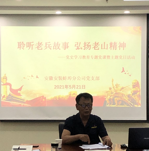 為深入開(kāi)展黨史學(xué)習(xí)教育活動(dòng),進(jìn)一步引導(dǎo)黨員干部學(xué)習(xí)黨史、銘記黨史,5月21日下午,蚌埠分公司黨支部組織開(kāi)展了一場(chǎng)“聆聽(tīng)老兵故事 弘揚(yáng)老山精神”黨史學(xué)習(xí)教育專題黨課暨主題黨日活動(dòng)。邀請(qǐng)?jiān)鴧⒓舆^(guò)對(duì)越自衛(wèi)反擊戰(zhàn)的退伍老兵,分公司在職員工年飛同志為大家上了一堂別開(kāi)生面的黨課。分公司班子成員、項(xiàng)目經(jīng)理、部門負(fù)責(zé)人及全體黨員參會(huì)。