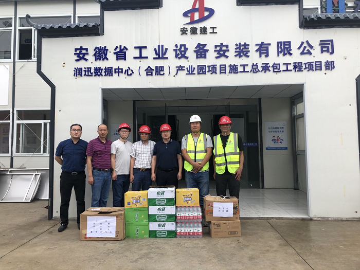 烈日炎炎,酷暑難當(dāng),6月16日,房建(裝飾)分公司黨支部書記王偉攜分公司工程管理部來到潤迅數(shù)據(jù)中心(合肥)產(chǎn)業(yè)園項目,看望和慰問奮戰(zhàn)在一線的員工,為他們送去仁丹、藿香正氣口服液、十滴水、飲料、藥品等防暑降溫物品,實地察看了項目工地和職工生活區(qū),并與項目同志進行了座談交流。