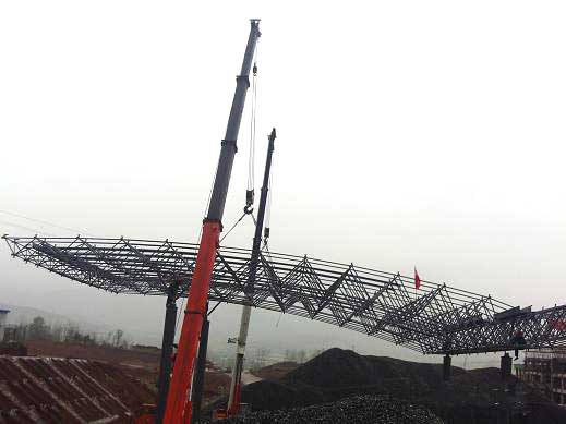 當(dāng)日上午9時整,隨著吊裝負(fù)責(zé)人一聲令下,一臺75T汽車吊作為主吊吊起鋼網(wǎng)架一端,兩臺25T汽車吊做輔吊吊起鋼網(wǎng)架另一端,50噸的大鋼網(wǎng)架徐徐升起,經(jīng)過調(diào)整、就位、固定,鋼網(wǎng)架終于穩(wěn)穩(wěn)地落在高高的鋼柱上,整個吊裝過程歷時不到1小時就安全完成。吊裝的科學(xué)合理安排、進(jìn)展的有序組織得到業(yè)主和監(jiān)理的贊許。