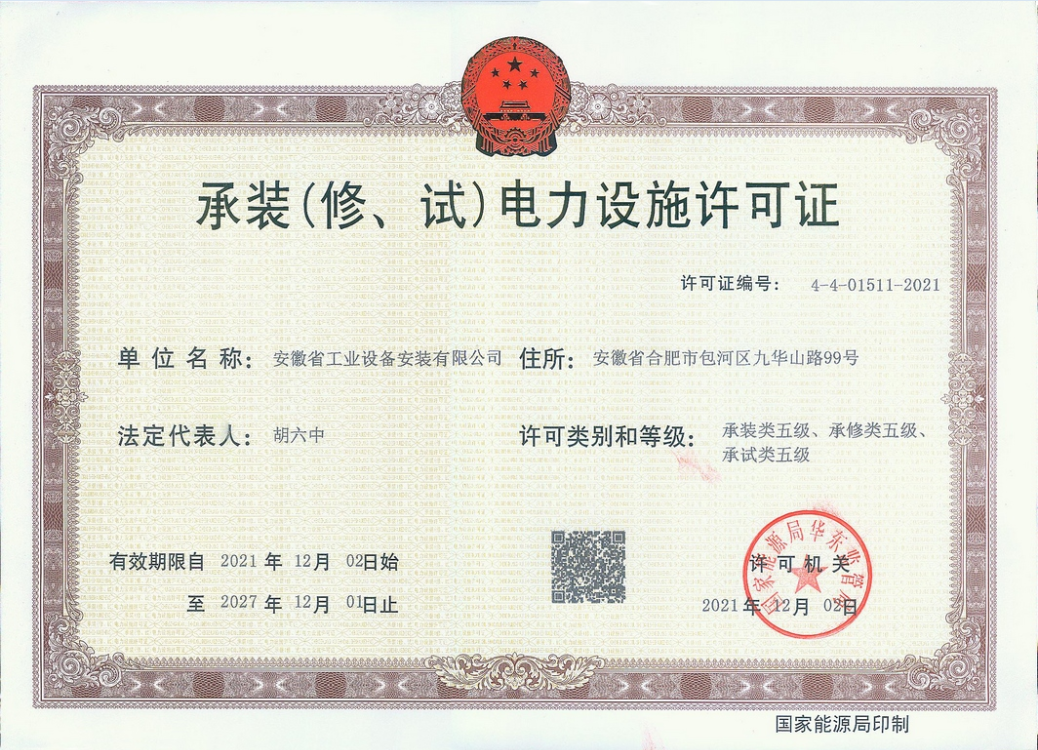 近日,安徽安裝公司申報(bào)的承裝(修、試)電力設(shè)施許可證資質(zhì)成功獲批。