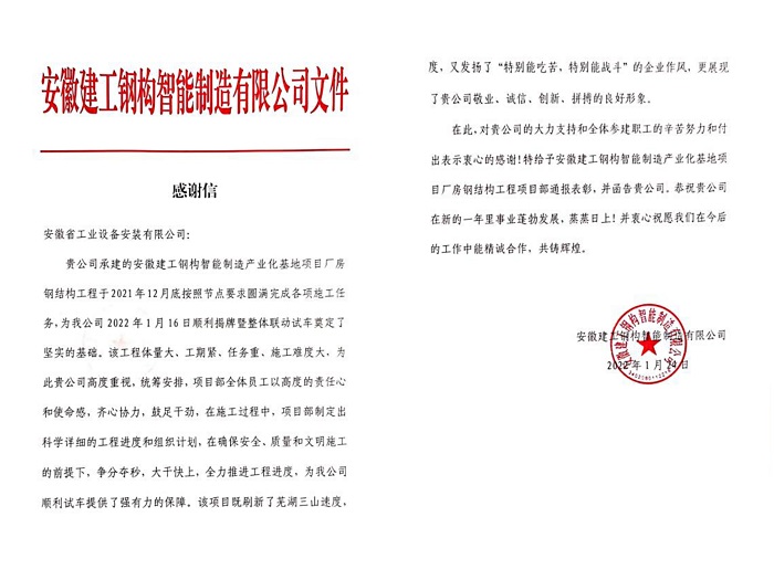 近日,公司安徽建工鋼構智能制造有限公司廠房鋼結構工程項目收到業(yè)主單位安徽建工鋼構智能制造有限公司感謝信,信中對建工鋼構廠房鋼結構工程項目部在工程施工中的辛苦努力和突出表現(xiàn)表達了高度贊譽和衷心感謝!