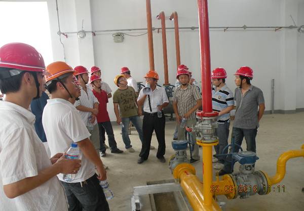觀摩開始前,戴書記及包處長進(jìn)行動(dòng)員講話,要求大學(xué)生一定要認(rèn)真聽講,珍惜這次觀摩學(xué)習(xí)的機(jī)會(huì)。項(xiàng)目部經(jīng)理趙永峰詳細(xì)介紹了工程概況及項(xiàng)目部對(duì)本工程的現(xiàn)場管理和安全生產(chǎn)、文明施工管理情況。業(yè)主周工對(duì)合成車間一、合成車間二的管道走向及工藝流程一一向大家講解,并對(duì)公用部分的設(shè)備功能逐一進(jìn)行了詳細(xì)的介紹。項(xiàng)目部鄭圣軍和徐松同志分別介紹了工藝管道、設(shè)備安裝和電氣安裝的相關(guān)流程。講解人講解細(xì)致,大學(xué)生們聽得認(rèn)真。