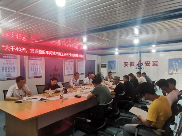 9月2日上午,安徽安裝蚌埠臨港智能制造產(chǎn)業(yè)園二期工程“大干40天,確保完成船舶車(chē)間地坪施工任務(wù)”勞動(dòng)競(jìng)賽主題大討論在項(xiàng)目部舉行。公司副總經(jīng)理高飛、趙伯平,紀(jì)委書(shū)記、工會(huì)主席李楊,工會(huì)副主席王敏,公司勞動(dòng)競(jìng)賽委員會(huì)相關(guān)職能部門(mén)負(fù)責(zé)人、蚌埠分公司班子成員、項(xiàng)目部員工共30余人參會(huì),會(huì)議由李楊主持。