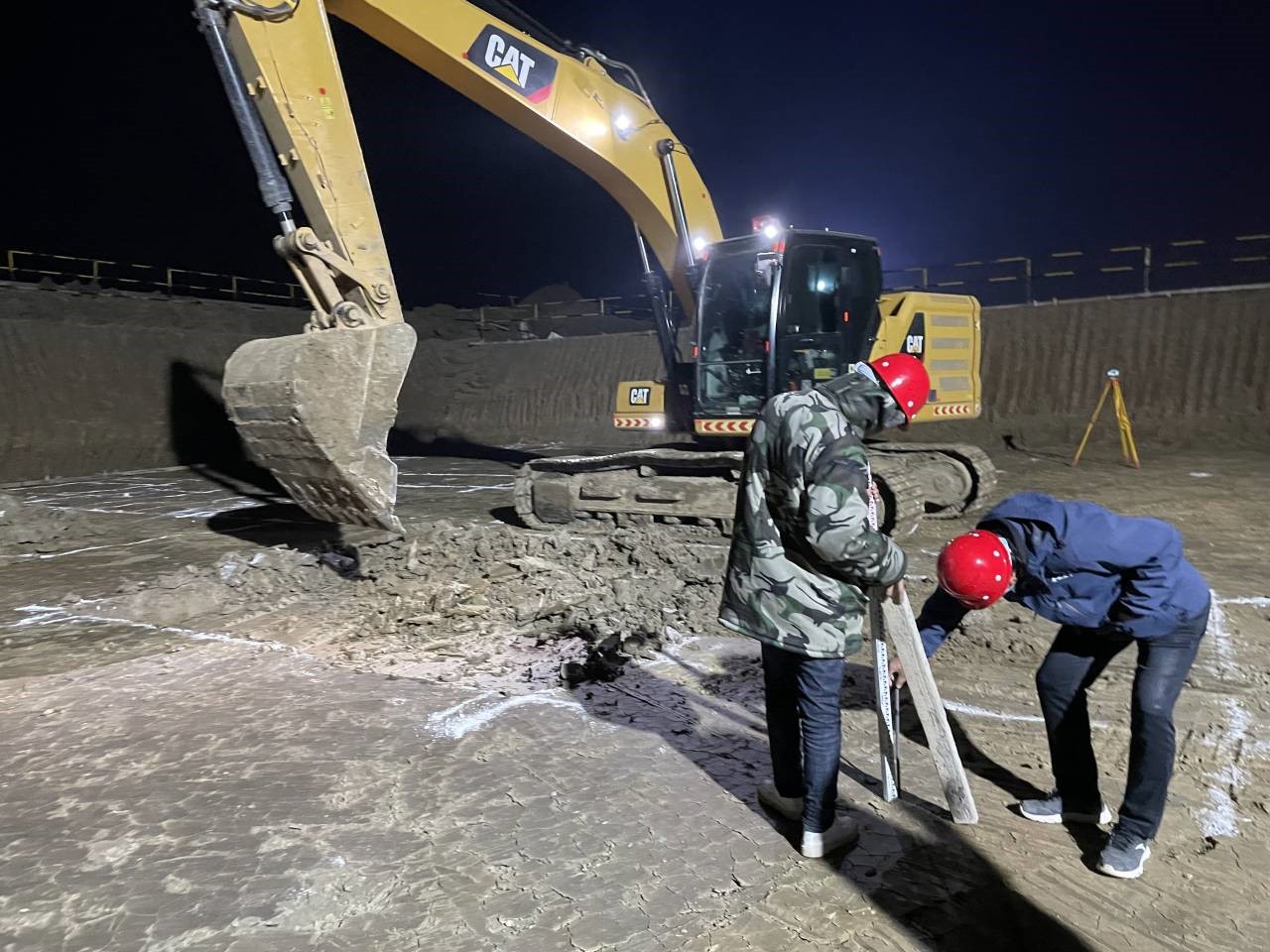 為滿足西動力中心承臺澆筑要求,施工現(xiàn)場燈火通明,項(xiàng)目經(jīng)理徐明東帶領(lǐng)施工員正在認(rèn)真進(jìn)行西動力中心承臺基礎(chǔ)測量復(fù)核工作。