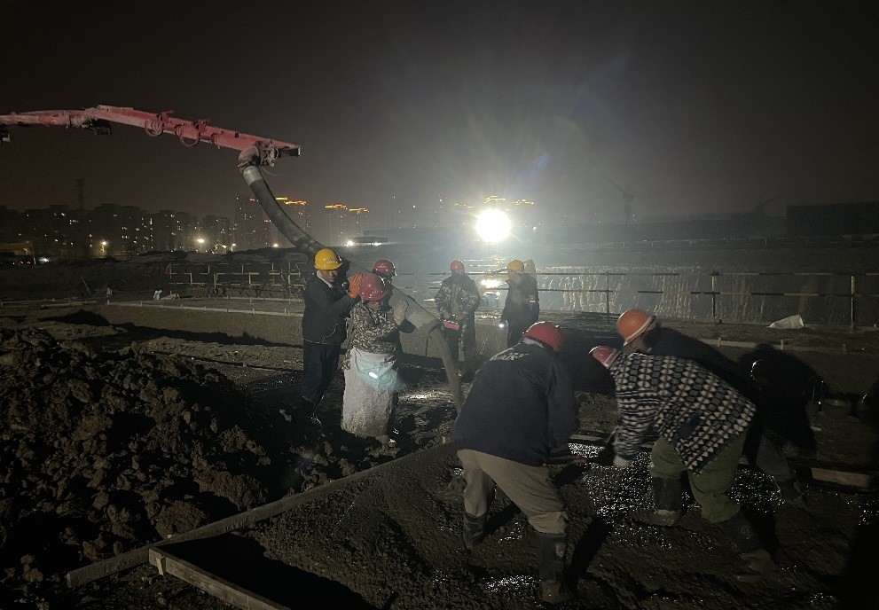 工人師傅們晚上加班加點(diǎn)進(jìn)行西動力中心基礎(chǔ)墊層澆筑