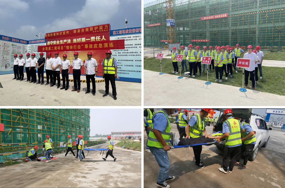 為了落實(shí)公司、分公司安全生產(chǎn)月的各項(xiàng)活動(dòng)部署,進(jìn)一步提升施工現(xiàn)場(chǎng)人員的安全防范意識(shí)及應(yīng)急救援處置能力,6月20日上午10點(diǎn),蚌埠分公司、房建(裝飾)分公司在凱盛科技超薄柔性玻璃二期項(xiàng)目施工現(xiàn)場(chǎng)聯(lián)合開展了“物體打擊”事故應(yīng)急救援演練活動(dòng),公司安全管理部副經(jīng)理蔣秀正、蚌埠分公司領(lǐng)導(dǎo)班子成員、房建(裝飾)分公司領(lǐng)導(dǎo)班子成員、監(jiān)理單位代表、項(xiàng)目人員共30余人參加演練。
