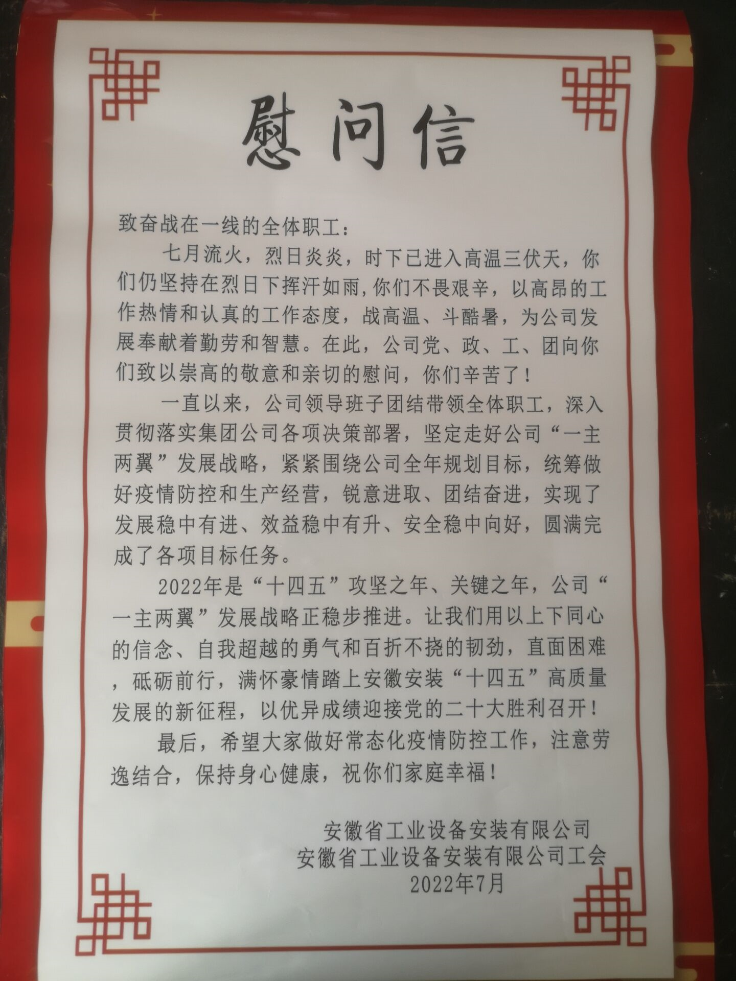 隨后在項(xiàng)目部會(huì)議室,李楊對(duì)集團(tuán)和公司兩級(jí)“十四五”發(fā)展戰(zhàn)略與規(guī)劃進(jìn)行了宣貫解讀。隨后代表公司向奮戰(zhàn)在一線的項(xiàng)目部員工表示慰問和感謝,送來了防暑降溫慰問品和慰問信,并與項(xiàng)目部員工進(jìn)行了親切交談。在談話中,李楊鼓勵(lì)項(xiàng)目部青年員工和新大學(xué)生要樹立好正確的世界觀、人生觀和價(jià)值觀,在工作中找準(zhǔn)定位,不斷提升業(yè)務(wù)能力,將個(gè)人的進(jìn)步與企業(yè)的發(fā)展緊密地結(jié)合在一起,與企業(yè)共同成長。