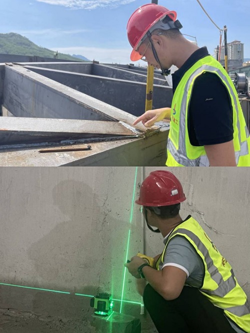 圖為岳西恒太城項目穹頂鋼結(jié)構(gòu)檢查及影廳看臺放線場景