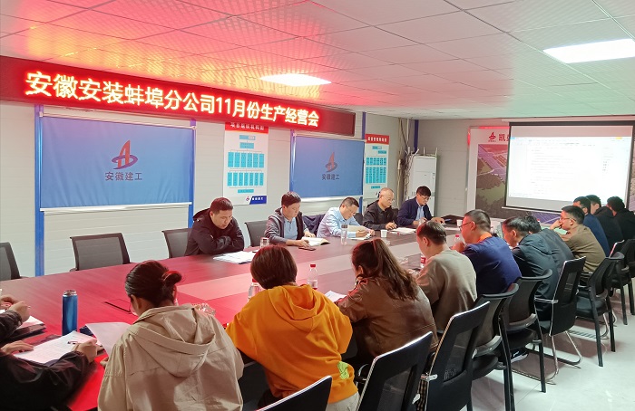 11月10日,蚌埠分公司在凱盛項目部召開11月份生產經營會。分公司領導班子成員、各項目主要負責人、機關各部門負責人及工程部全體員工參加會議,會議由分公司副經理郭洋主持。