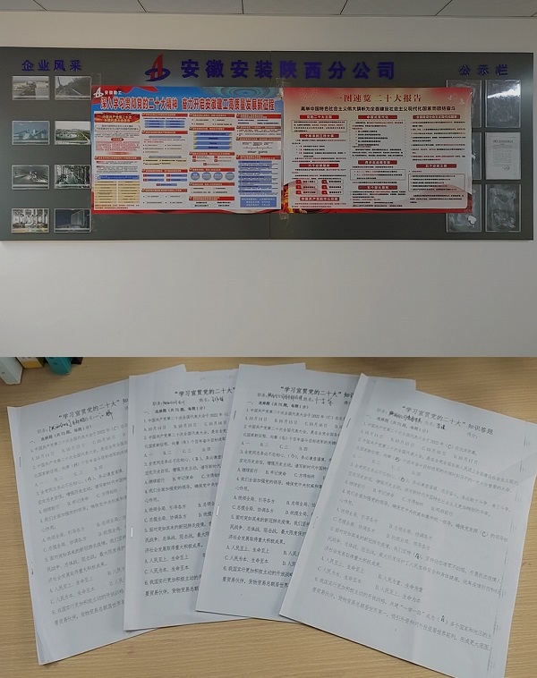為抓好抓實(shí)黨的二十大精神的學(xué)習(xí)宣傳貫徹工作,近期,陜西分公司黨支部以“三會(huì)一課”、職工大會(huì)的形式組織開展黨員干部職工學(xué)習(xí)黨的二十大精神學(xué)習(xí)研討會(huì);分公司開展“學(xué)習(xí)宣貫黨的二十大”知識(shí)答題活動(dòng),以考促學(xué),以學(xué)促知,以知促用,充分檢驗(yàn)學(xué)習(xí)效果;通過制作黨的二十大精神宣傳圖,開展立體式廣泛宣傳,推動(dòng)大會(huì)精神深入職工群眾;通過開展一系列特色學(xué)習(xí)教育與宣傳活動(dòng),切實(shí)把黨的二十大精神帶到職工群眾身邊,為提高黨員干部職工對(duì)黨的二十大精神的全面掌握與學(xué)習(xí)起到促進(jìn)作用,使黨的二十大精神成為分公司各項(xiàng)工作發(fā)展的思想與行動(dòng)綱領(lǐng)。