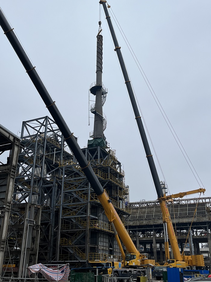 該項(xiàng)目原有煙囪吊耳主軸低于規(guī)范要求,存在安全隱患,因此在本次檢修期間重新制作并利用吊籠在高空焊接安裝吊耳。該煙囪及附件整體重約50噸,設(shè)備位于25米框架頂,煙囪長(zhǎng)35米,煙囪頂部距地面60米,受施工空間影響,采用動(dòng)態(tài)施工的組織方法,利用500T吊車(chē)主吊與130T吊車(chē)溜尾、高空組對(duì)焊接及分段吊裝等技術(shù)確保該煙囪順利吊裝。