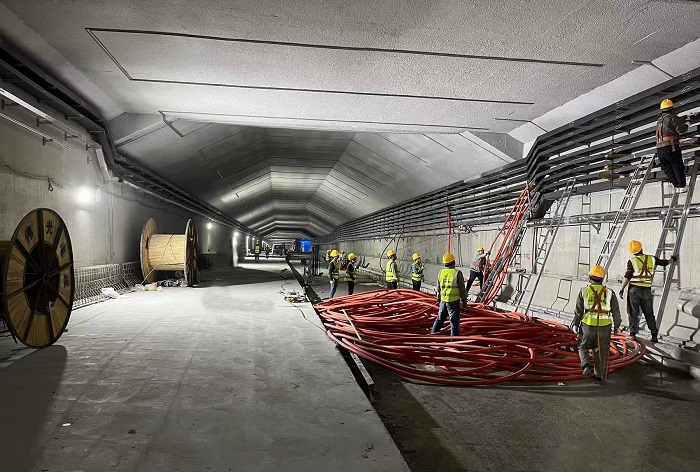 目前,項目下穿隧道東、西側(cè)1#2#配電房一次性送電成功,能夠提供隧道現(xiàn)場施工用電,東側(cè)雨水泵房和中間廢水泵房已完成施工任務(wù),隧道里的橋架安裝、電纜敷設(shè)、消防水管安裝、照明燈具安裝及各附屬設(shè)施安裝建設(shè)也正在加速進行當中。