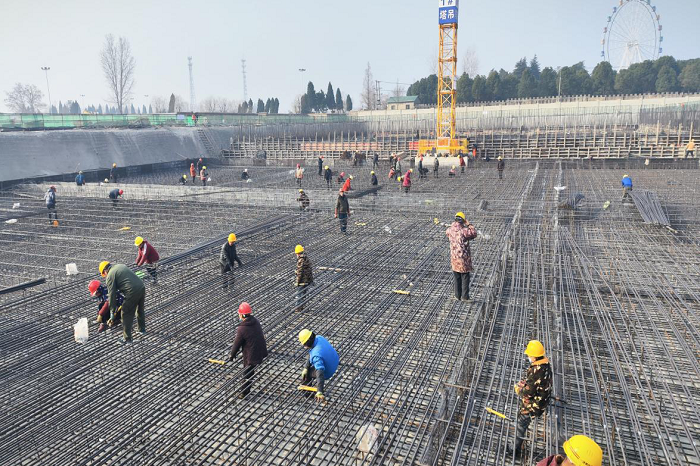 圖為施工現(xiàn)場水解酸化池筏板鋼筋綁扎
