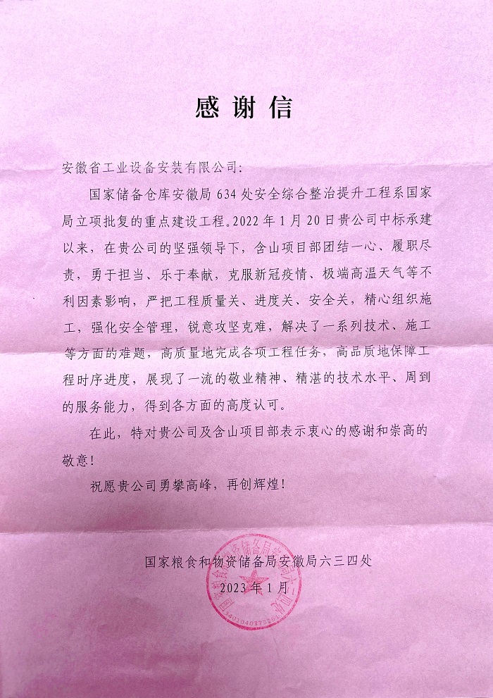 近日,安徽安裝合肥分公司收到業(yè)主方國家糧食和物資儲備局安徽局六三四處的感謝信,對公司“國家儲備倉庫安徽局634處安全綜合整治提升工程”克服諸多困難,精心組織,科學管理,高質量完成工程施工任務的突出成績給予高度贊揚,并表達了由衷感謝。
