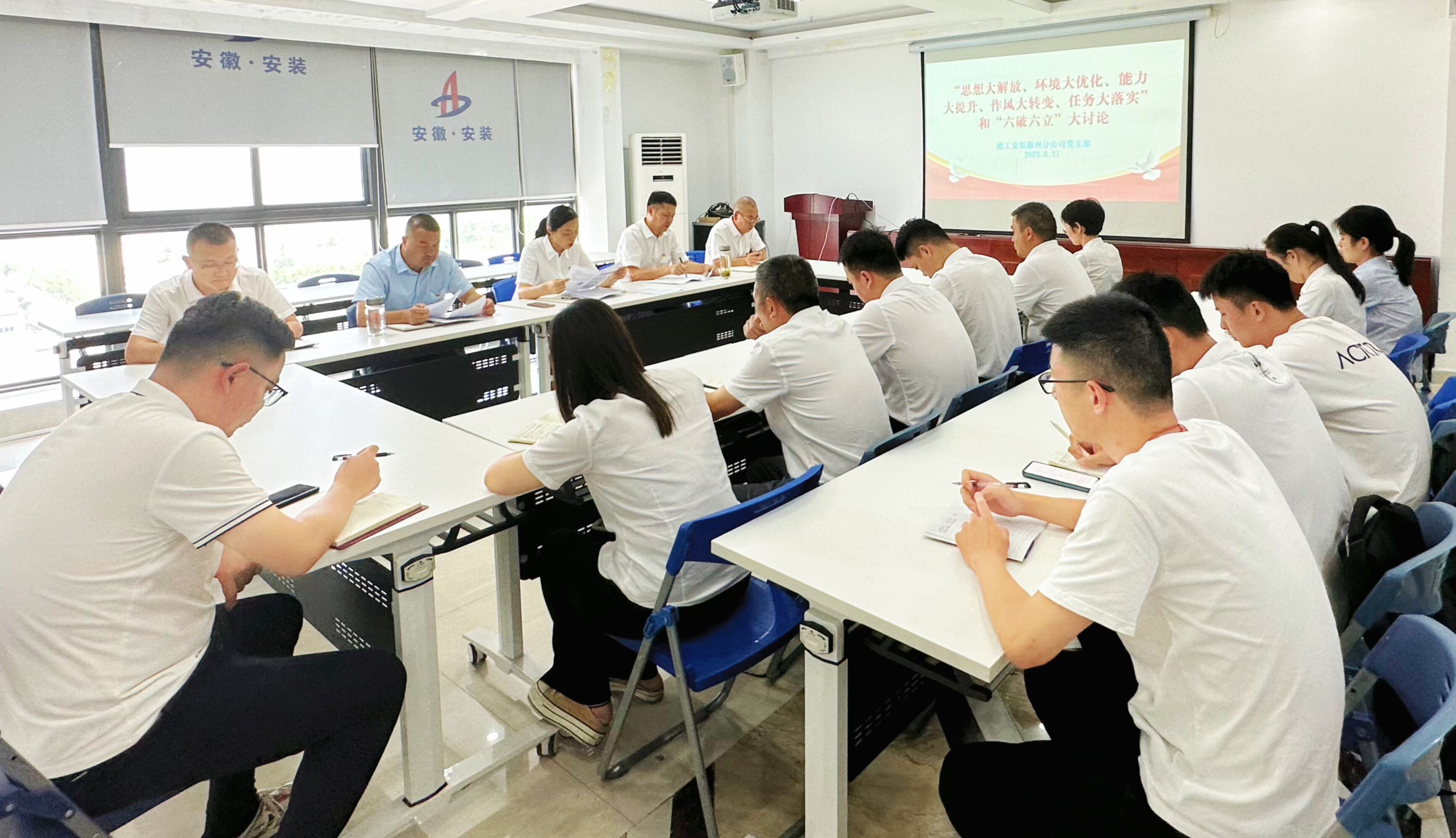 8月21日下午,建工安裝滁州分公司黨支部圍繞“思想大解放、環(huán)境大優(yōu)化、能力大提升、作風(fēng)大轉(zhuǎn)變、任務(wù)大落實”和“六破六立”要求,認(rèn)真組織開展了大學(xué)習(xí)大討論。分公司黨支部書記、副經(jīng)理程茂麗主持會議,分公司班子成員、黨員和入黨積極分子參加會議。