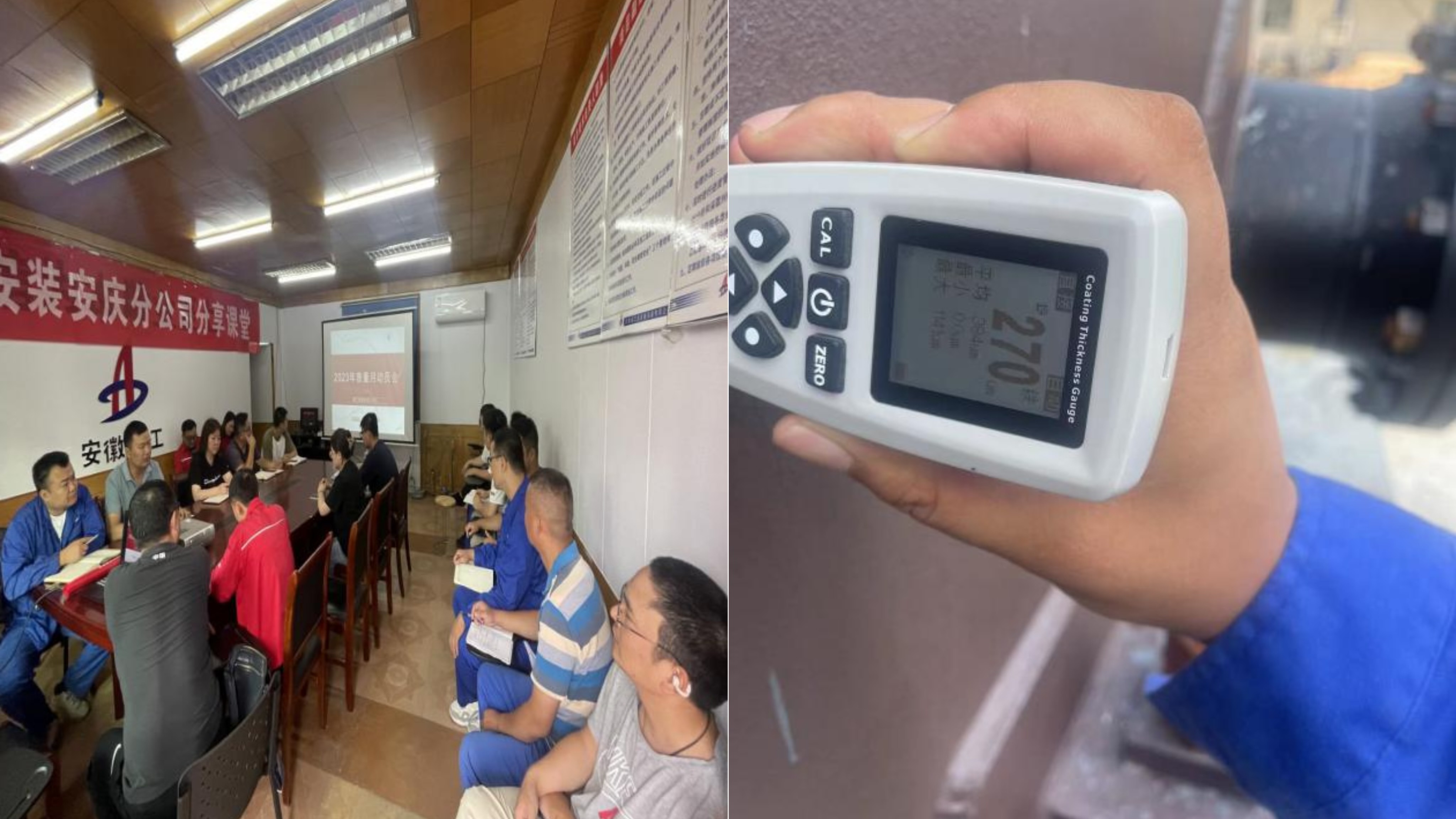 安慶分公司組織機(jī)關(guān)及所屬項目舉行“質(zhì)量月”動員會,安慶石化循環(huán)水項目開展儲罐防腐保溫專項檢查(檢查中間漆涂層厚度)