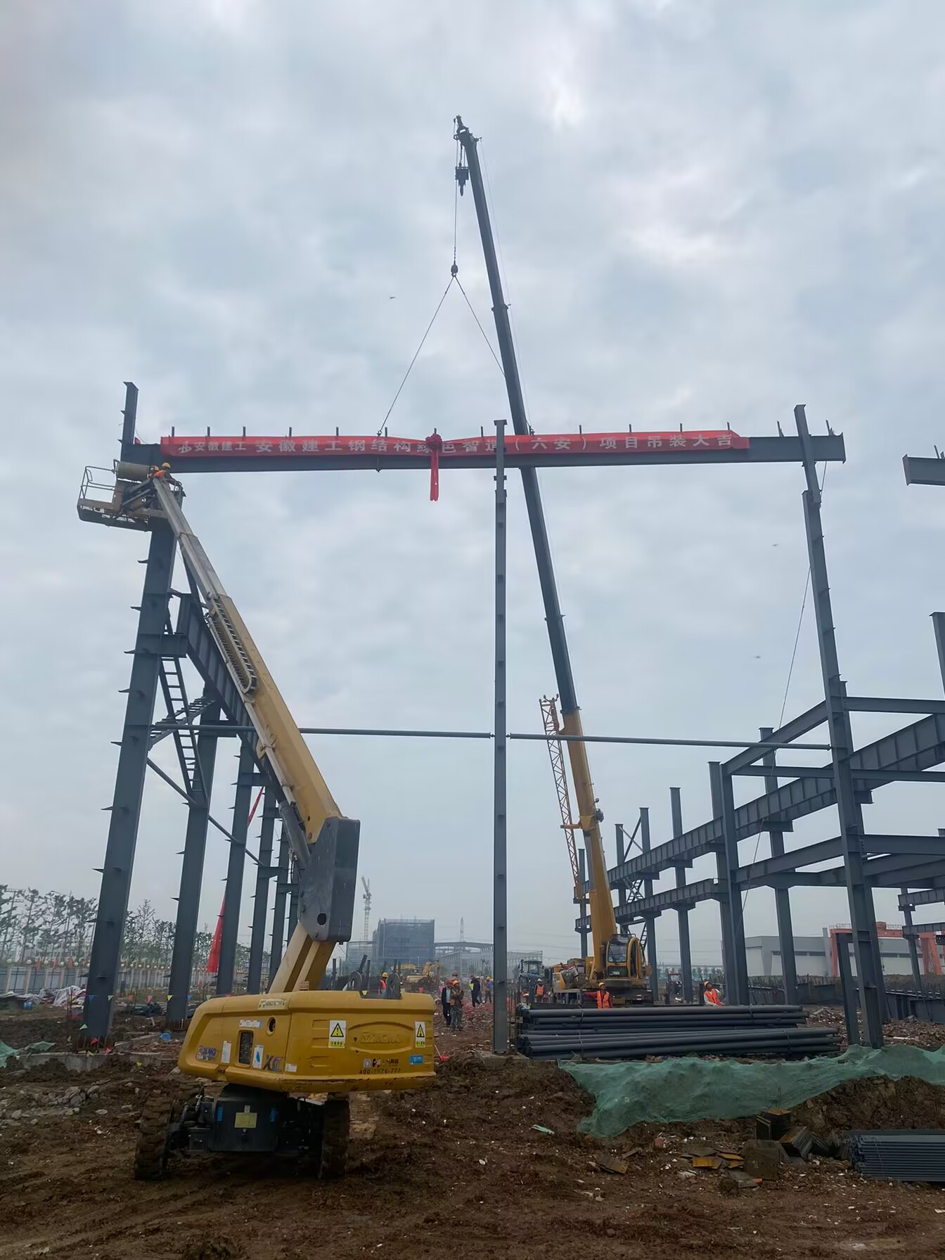 本次吊裝的柱間跨度為36米、安裝高度18米,項目部科學組織施工專項吊裝方案并通過專家論證。五一期間項目部全體員工主動放棄休假,堅守崗位,搶抓有利天氣,爭分奪秒搶工期,加班加點趕進度,奏響施工大干最強音。