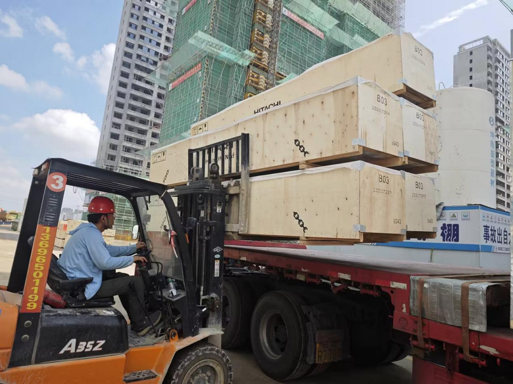 派河印象·杏語林溪項(xiàng)目施工人員正在給到場電梯卸貨