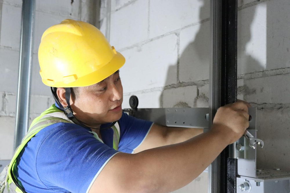 蚌埠傳感谷(寧波蚌埠微電子產(chǎn)業(yè)園一期)項(xiàng)目施工人員正在安裝電梯轎廂門