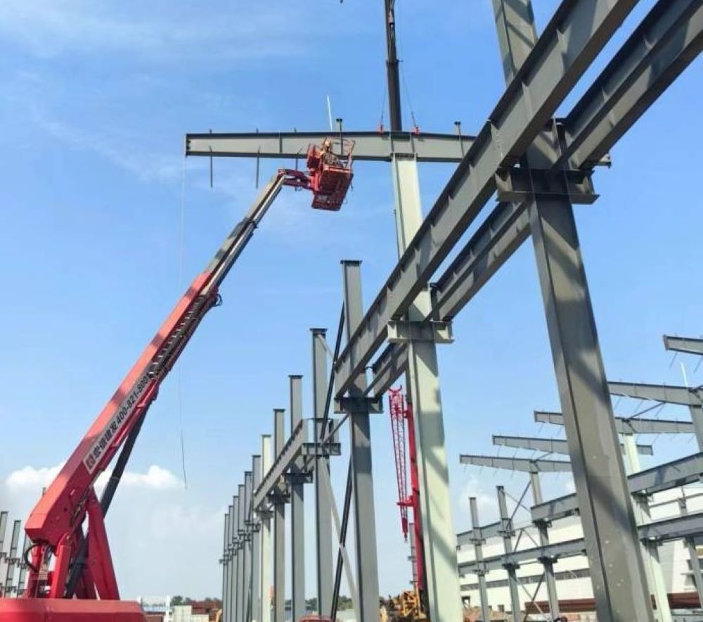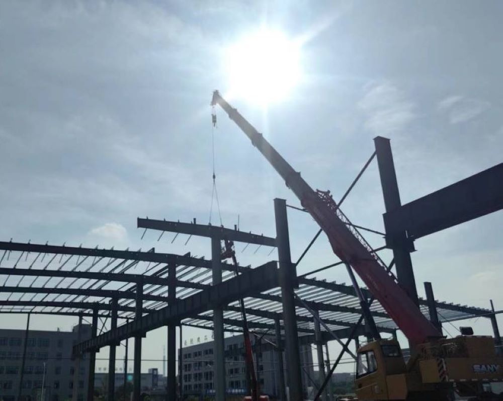 目前1-18軸鋼柱已全部安裝完成,1-6軸柱撐、鋼梁、屋面檁條已安裝結束。同時應對持續(xù)高溫天氣,項目部合理安排作業(yè)時間,施工人員分工協作,錨定節(jié)點目標,全力以赴趕工期、搶進度。預計9月底完成建工鋼構智能制造基地4#廠房項目全部工程量。