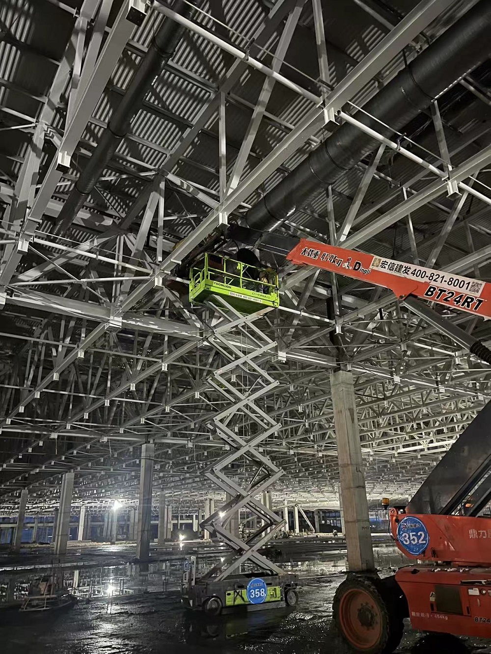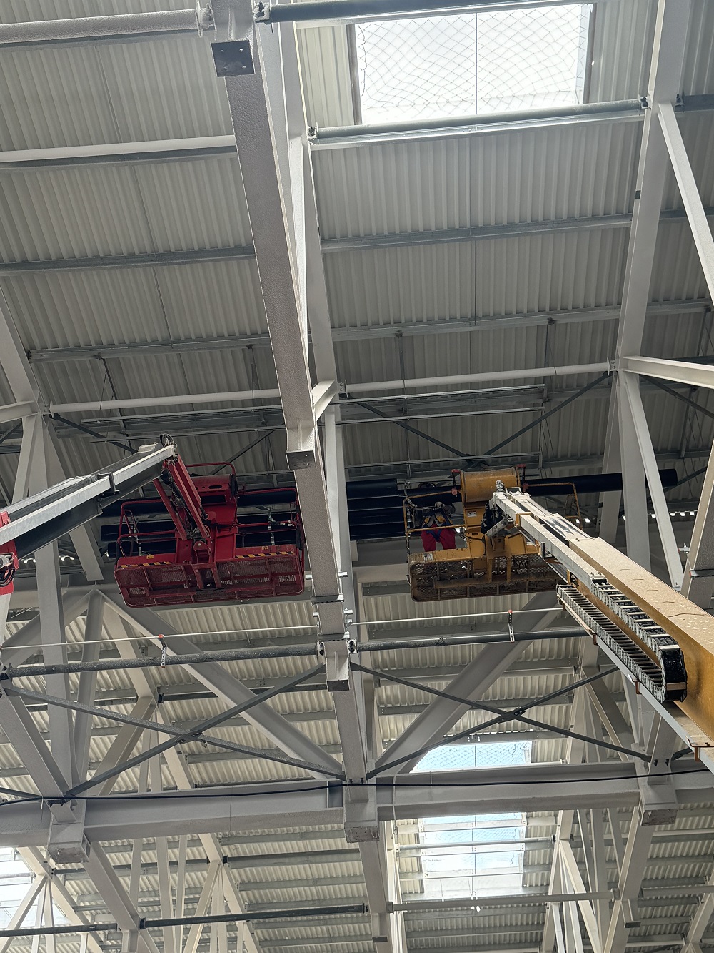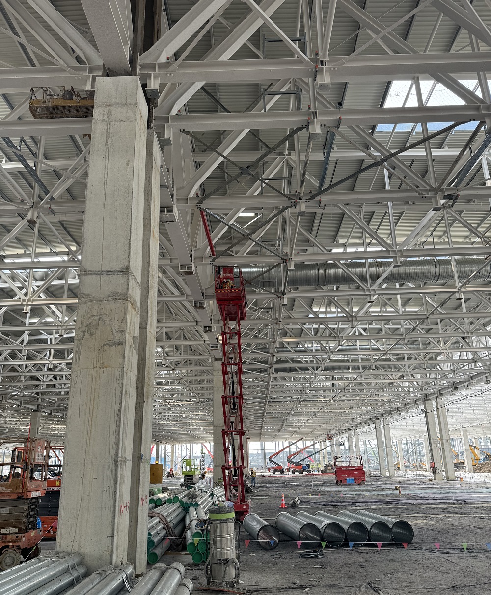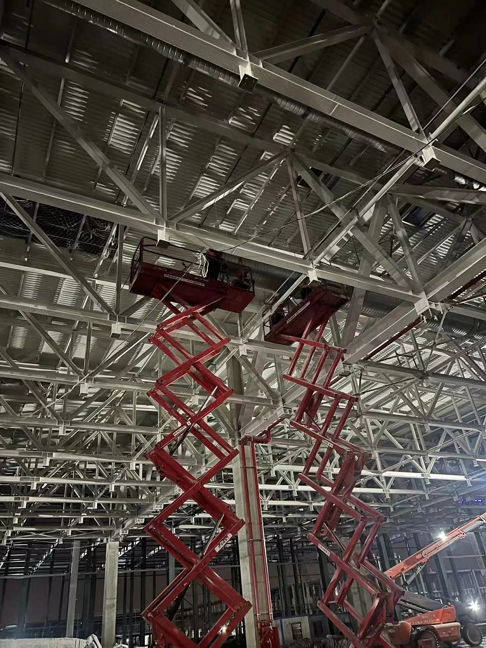 目前正在進行車間一1-6區(qū)通風管、照明管、橋架、虹吸雨水管、衛(wèi)生間排水管、防雷接地、消防管等安裝作業(yè),材料加工區(qū)預制各類管道支架也在同步推進?,F已完成車間一風管安裝約3000平方米,風管預制約8000平方米,虹吸雨水管道安裝約120米,照明配管安裝約2000米,消防管道安裝約320米,防雷接地網安裝約10000米,橋架安裝約400米。