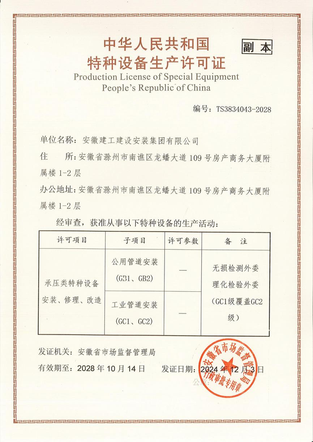 近日,建工安裝“承壓類特種設(shè)備安裝、修理、改造—壓力管道(GB1、GB2)、(GC1、GC2)”延續(xù)換證工作順利通過中國工業(yè)氣體工業(yè)協(xié)會(huì)、安徽省特種設(shè)備檢測(cè)院等各方的評(píng)審核查,現(xiàn)已取得安徽省市場監(jiān)督管理局頒發(fā)的新證,為公司相關(guān)業(yè)務(wù)的開展奠定了良好基礎(chǔ)。