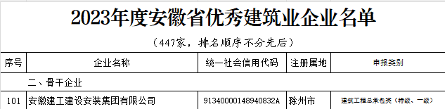 近日,安徽省住房和城鄉(xiāng)建設(shè)廳、安徽省交通運輸廳、安徽省水利廳、安徽省通信管理局聯(lián)合發(fā)布《關(guān)于公布2023年度安徽省優(yōu)秀建筑業(yè)企業(yè)名單的通知》(建辦〔2025〕41號),安徽建工建設(shè)安裝集團有限公司入選“2023年度安徽省優(yōu)秀建筑業(yè)企業(yè)”。