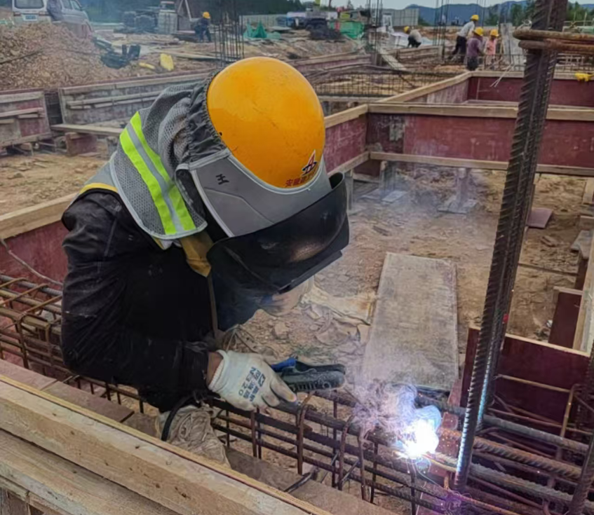 工人穿著汗透的工作服冒著酷暑進行基礎(chǔ)防雷接地焊接