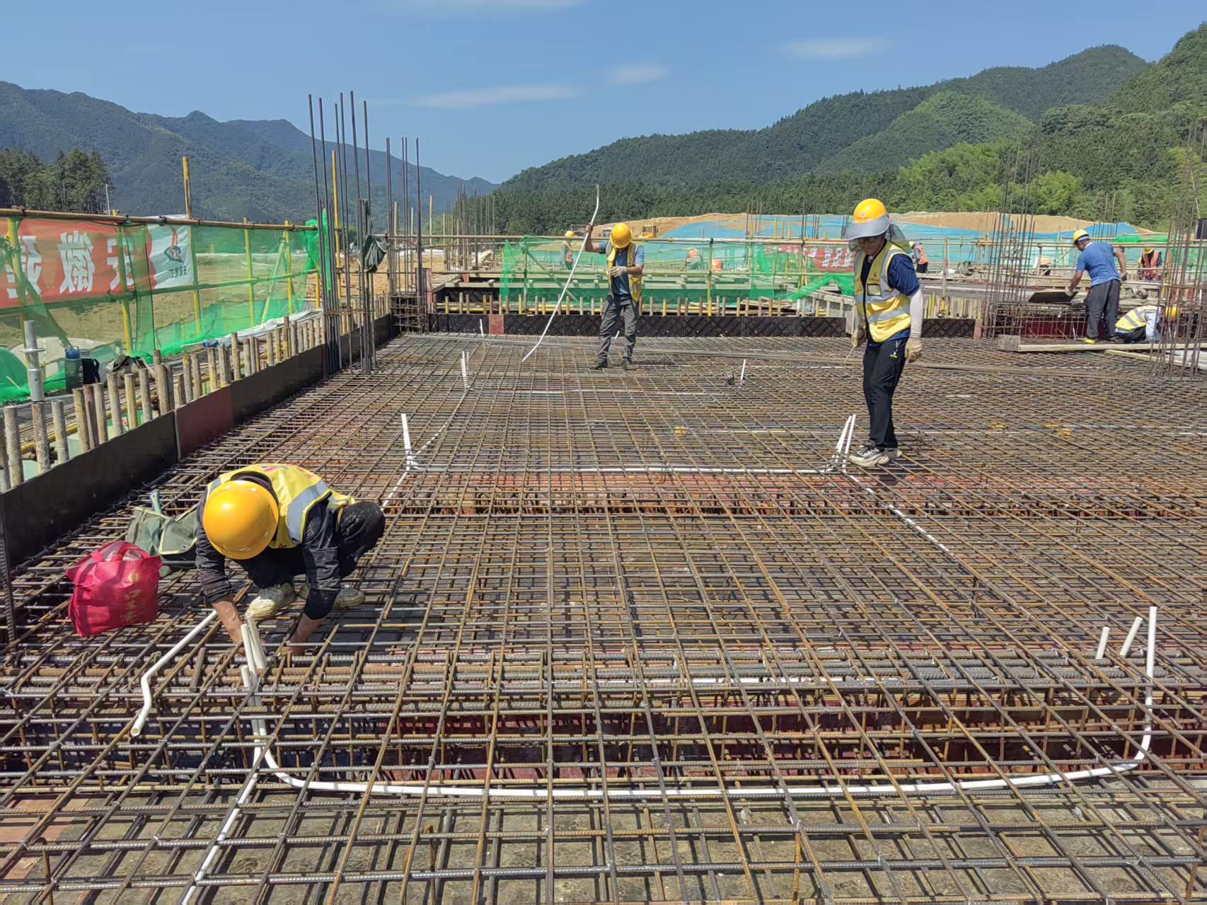 工人埋頭苦干進行水電線管預(yù)埋